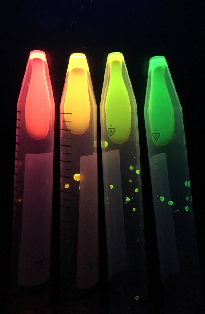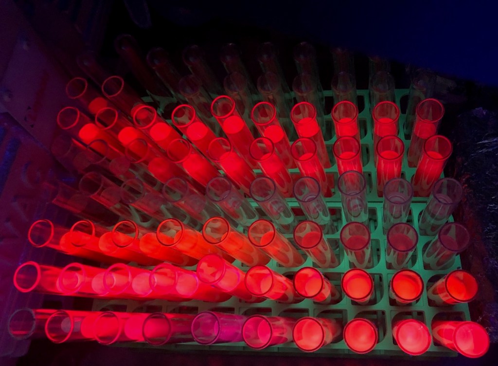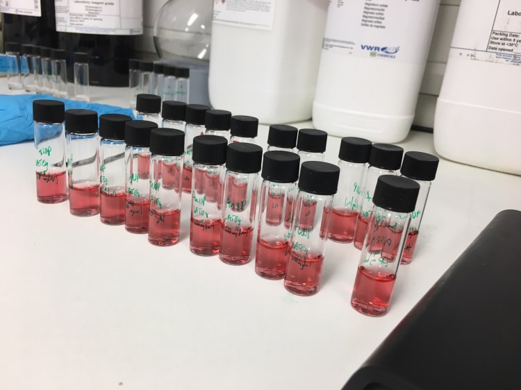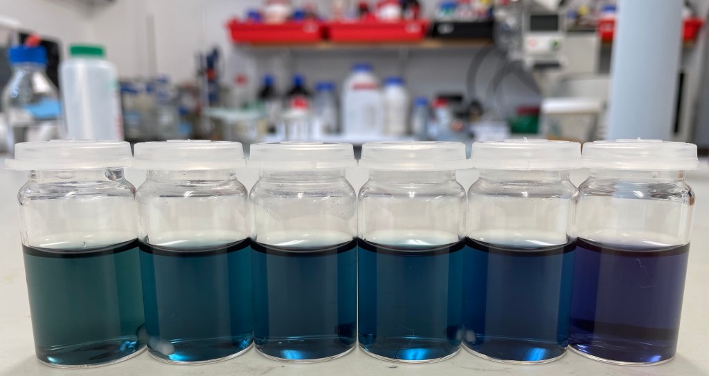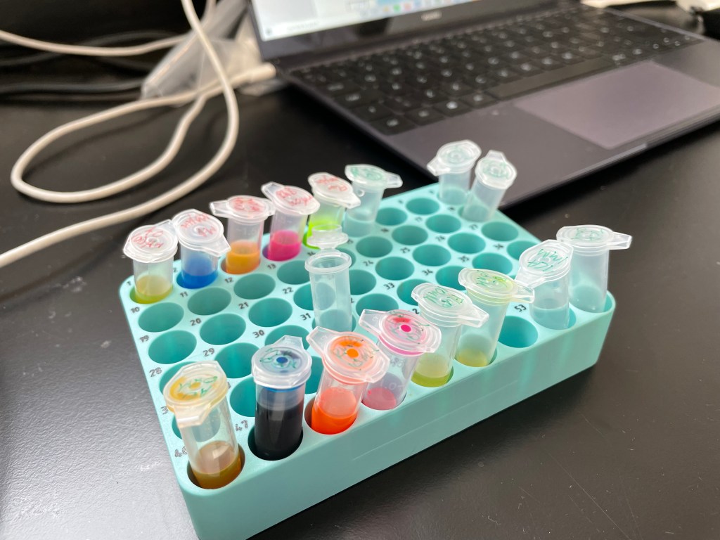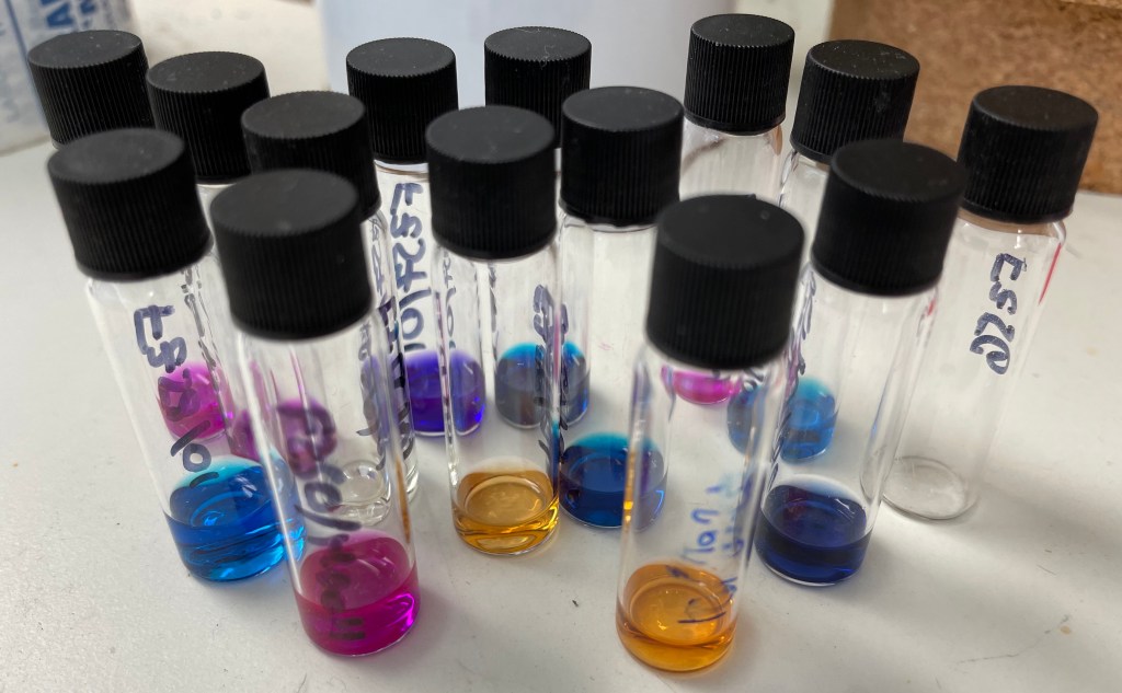 Colourful samples awaiting analysis by HPLC-MS